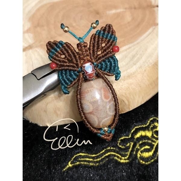 蝴蝶造型編繩墜頭設計,搭配彩花雙面透光料桶珠