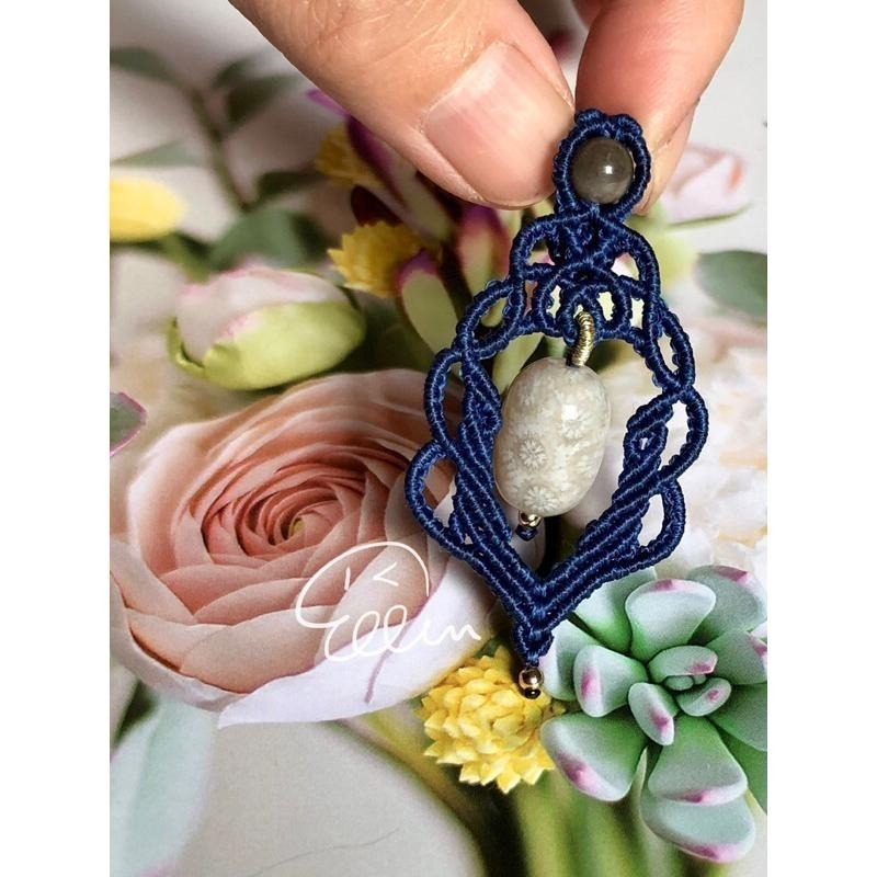 蠟線編織波紋流線的設計墜頭,手工編製彩金線圈懸掛著莫蘭迪灰白色系桶珠,帶略略剔透的幾朵小花,清新雅致