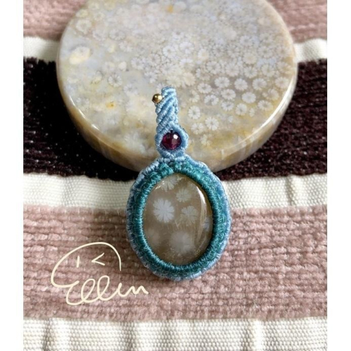 帶著飄逸的小白花形的珊瑚玉蛋面吊墜,以包邊後疊加整圈花樣的編織設計