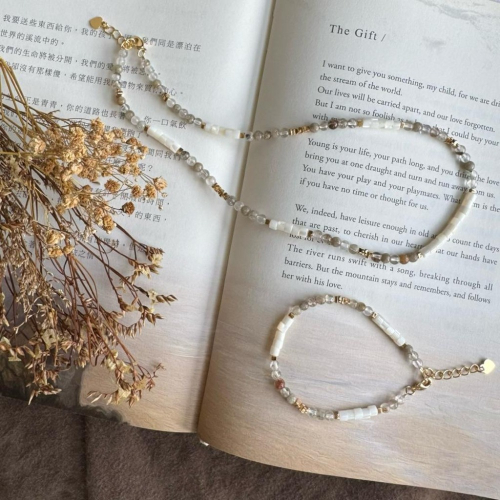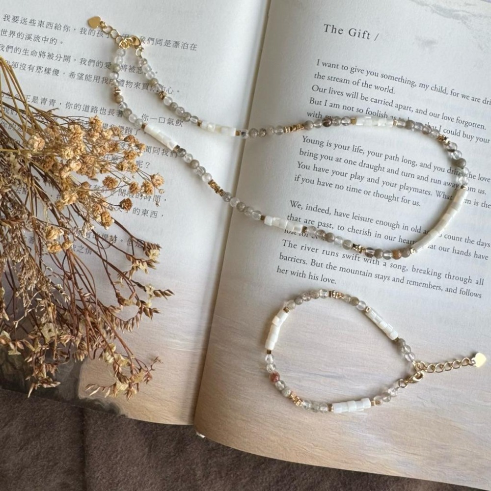 #彩幽靈 #白母貝 #文青 #頸鍊 #手鍊 #療癒系飾品 #天然石 #手作飾品 #清新 #日常百搭 #淡雅色 #靜謐 #微光 #自然系 #森系 #套組 在輕柔的日光下 彩幽靈的微光與白母貝的奶白柔光相互交織 像把自然的氣息悄悄戴在身上 透明溫潤的色調 細膩的光影與清新文青感為主軸 呈現低調卻迷人的質感