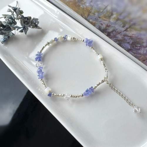 ✨ 在柔光與寧靜之間,坦桑石的靈光藍、白母貝的月色光、白水晶的透亮清澈交織成詩。再以碎銀純銀點綴,如星光散落手腕,映照出內在那份柔軟而堅定的光