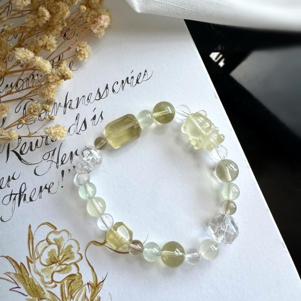 這款清新系水晶手鍊,精選白水晶、葡萄石、竹葉青、檸檬黃、魔晶宙斯黃水晶等天然水晶搭配立體天使翅膀熊熊雕刻設計,象徵財運守護與平安如意。晶體通透柔和,色調如晨曦般溫潤寧靜,展現療癒與好能量的完美融合,黃水晶招財、葡萄石安定心神、白水晶淨化磁場