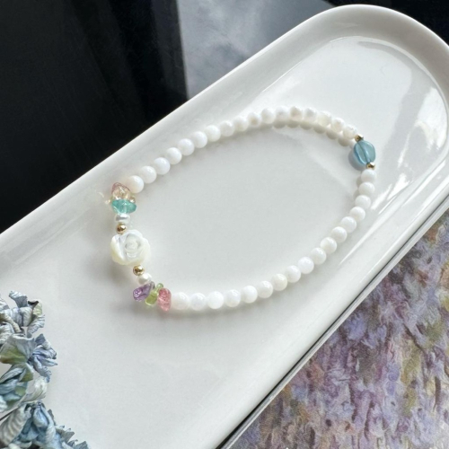 此款手串採用多種有機物(珍珠、白母貝、貝殼珠)製作而成,佩戴時須注意避免接觸化妝品、化學品、有機溶劑(例:酒精、香水)汗液等酸性物質,洗澡、游泳、泡溫泉時取下,避免高溫和暴曬,建議佩戴後用清水清洗以軟布吸水擦乾後避光保存