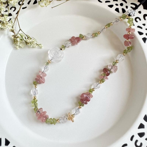 ✧ 以台灣製的玉線(堅固耐用)搭配天然奶白水晶雕刻玫瑰花及天然的草莓晶、橄欖石原石的碎石編製而成的手機掛繩,也可當包掛等掛飾 * 天然的草莓晶每顆顏色深淺形狀大小內含物等都會有所不同