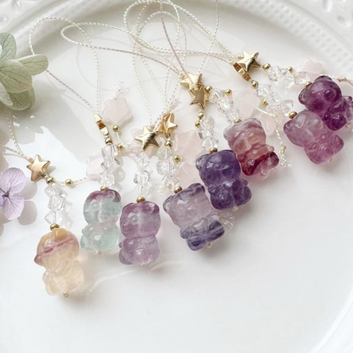 #螢石雕刻熊熊手機吊飾 #萌萌可愛 #白水晶 #粉晶星星
