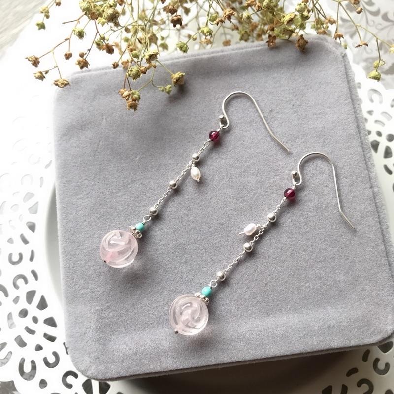 #原創 #s925純銀耳環 #純銀耳環 #垂墜式耳環 #粉晶耳環 #淡水珍珠 #綠松石 #石榴石 #紫牙烏 #手作飾品 #玫瑰花耳環