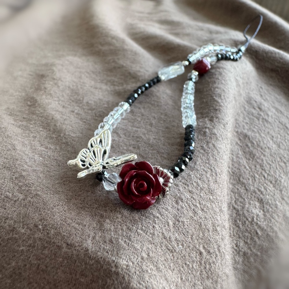 #甜美暗黑 #暗夜玫瑰 #硃砂玫瑰花 #黑尖晶石 #白水晶 #奧地利水晶 #水晶手機掛繩 #療癒 #氣場守護 #淨化好物 #黑紅配色 #暗黑系 #蝴蝶