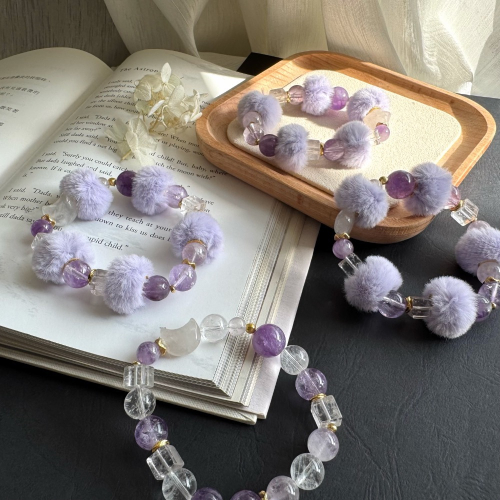 紫色水晶與毛球在手腕上留下溫柔的氣息