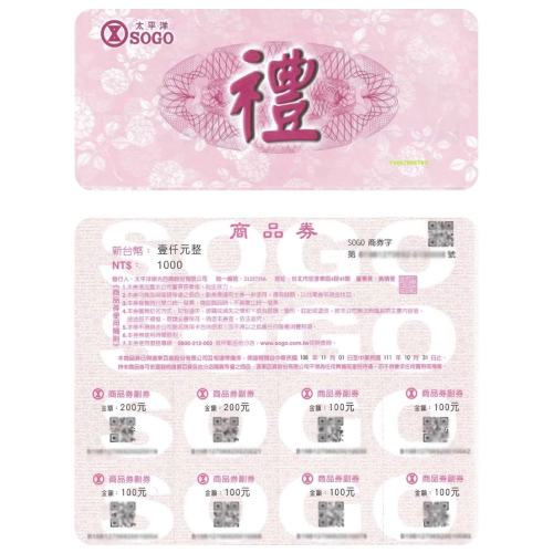 • 「本公司發行之雲端電子商品券由中國信託商業銀行股份有限公司提供限額履約保證,即以雲端電子商品券之餘額為限,保證期間自銷售日起13個月止,保證期間屆至後自動解除全部保證責任。」及「消費者因持有本公司雲端電子商品券而享有之相關權益,請詳閱本公司網站(http://info.sogo.com.tw/)」