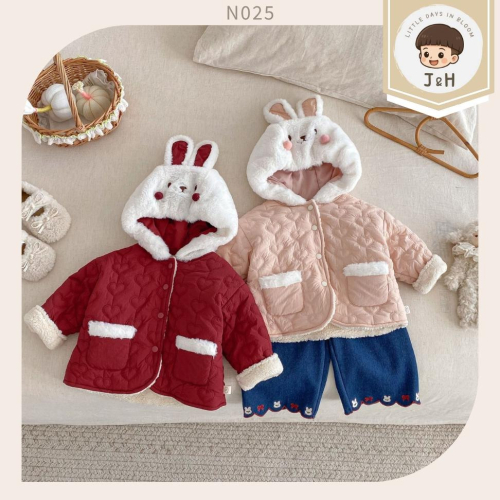 N025【預購】女童韓版兔耳朵加厚鋪棉造型連帽外套2色 紅/粉 (73~120)