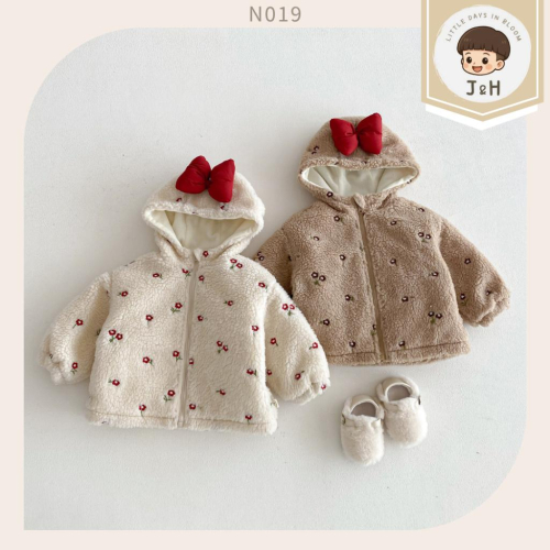 N019【預購】女童可愛蝴蝶結繡花毛毛外套 卡/米色 冬季保暖刷毛加厚外套 (73~120)