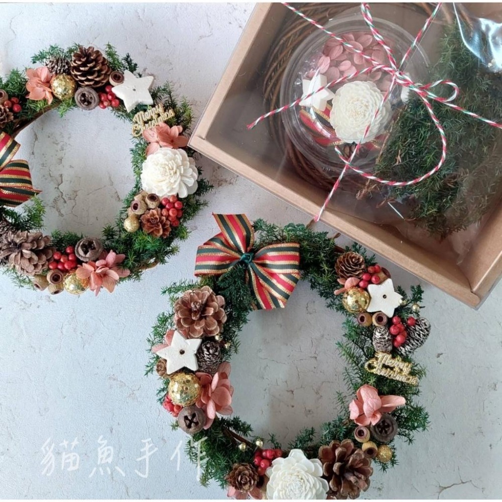 ✔ 不凋雪松 ✔ 多種果實 ✔ 索拉玫瑰 ✔ 索拉星星 ✔ 不凋繡球花 ✔ 英文字牌 ✔ 手打蝴蝶結 ✔ 金球裝飾