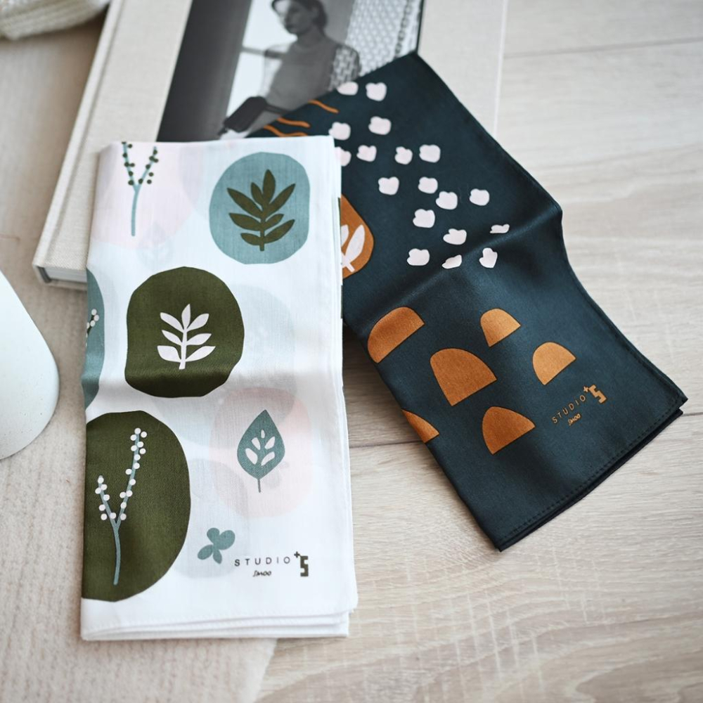 丸丸選品日本帶回日本製手帕IBUH純棉幾何設計圖抽象領巾葉子白色深藍