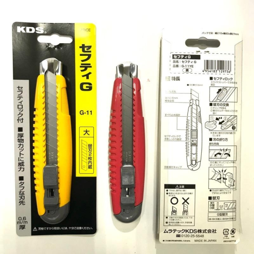 日製KDS美工刀G11,內附刀片2片、有紅黃2色、 刀片鋒利、另有專用刀片粗7節與細14節、10片裝/1小條、