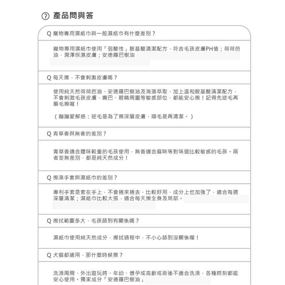 ◎ 如寵物使用後有異常反應,請馬上停止使用並立即請教獸醫師。◎ 本濕巾不溶於水,請勿丟棄於馬桶內。