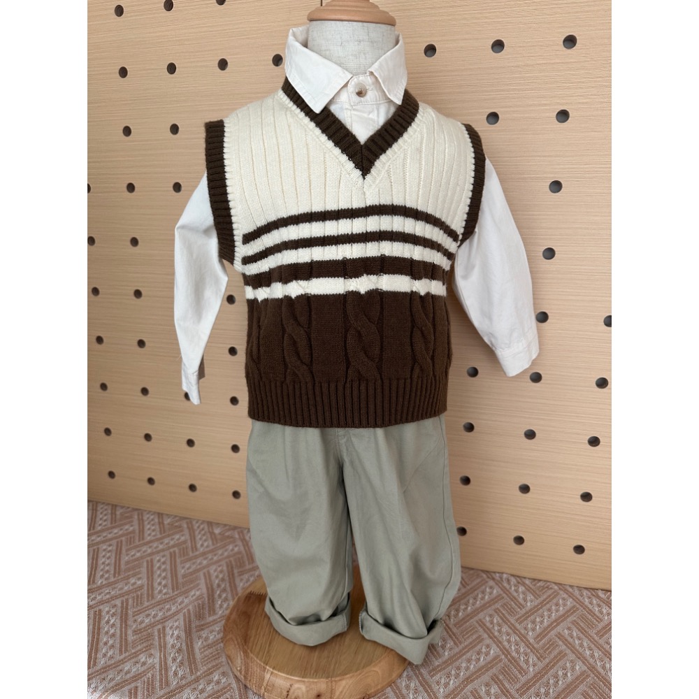 • 經典學院風設計: 奶油白與質感深棕的配色,搭配V領條紋設計和精緻麻花編織,輕鬆打造小紳士的英倫學院風格!