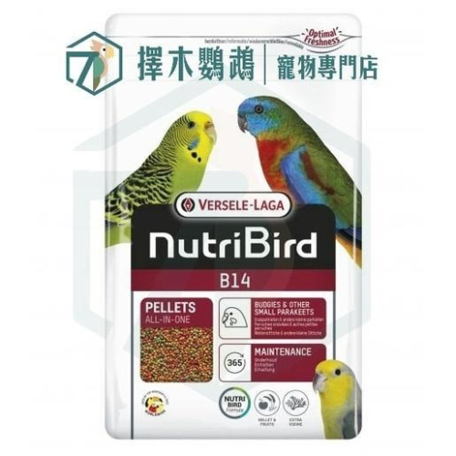 【產品描述】 鸚鵡專用 (無殼飼料、斷奶聖品、全球獸醫師與營養師一致推薦) 中、小型鸚鵡: □ B14日常主食 □ B18繁殖期主食 NUTRIBIRD 機能滋養丸系列特點: A. 科學配方結合多種精選食材、水果的完全飼料。 B. 添加多種維生素、蛋白質、礦物質、碘元素、葉酸、胡蘿蔔素等營養元素。 C. 經熟化處理,衛生有保障並易消化,可提高食材的利用率。 D. 日常專屬配方(B14/G14/P15),採用磷鈣最佳黃金比例,有益於骨骼與機能強健。 E. 繁殖專屬配方(B18/G18/P19),提高蛋白質與鈣質,補充完整營養,有益於孵化率與雛鳥健康。 F. 全系列添加天然礦土與益生元,維護消化道功能與羽毛亮麗。 G. 採用天然色澤元素,符合寵鳥飲食習慣,增加適口性。 H. 滋養丸可緩解挑食問題,添加絲蘭維持環境清潔與減低臭味。 I. 採用食品級氮氣包裝,維持食品最佳狀態。 成分: 穀物 | 水果(蘋果) | 蔬菜 | 植物蛋白萃取物 | 礦物質 | 植物來源衍伸物 | 植物性油脂 | 甘露寡醣(MOS) | 絲蘭 B14、B18額外添加: 小米、藻類等。 G14、G18、P15、P19額外添加: 堅果、花生等。 建議換食方法與使用方式: - 每天更新食物(80%)和乾淨的飲用水,可搭配多種蔬果(20%),讓食材更豐富、美味。 - 兩周時間使用2(新飼料):8(舊飼料)的飼料比例法則,調整新舊飼料比例,達成換食的目的。 - 採用多元與互動方式餵食,例如:滋養丸搭配合蔬果泥餵食或放入蔬果內,增加餵食樂趣。 - 可將滋養丸磨成粉狀,配合凡賽爾A21、A19等營養素餵食雛幼鳥,增加其風味與適口性。