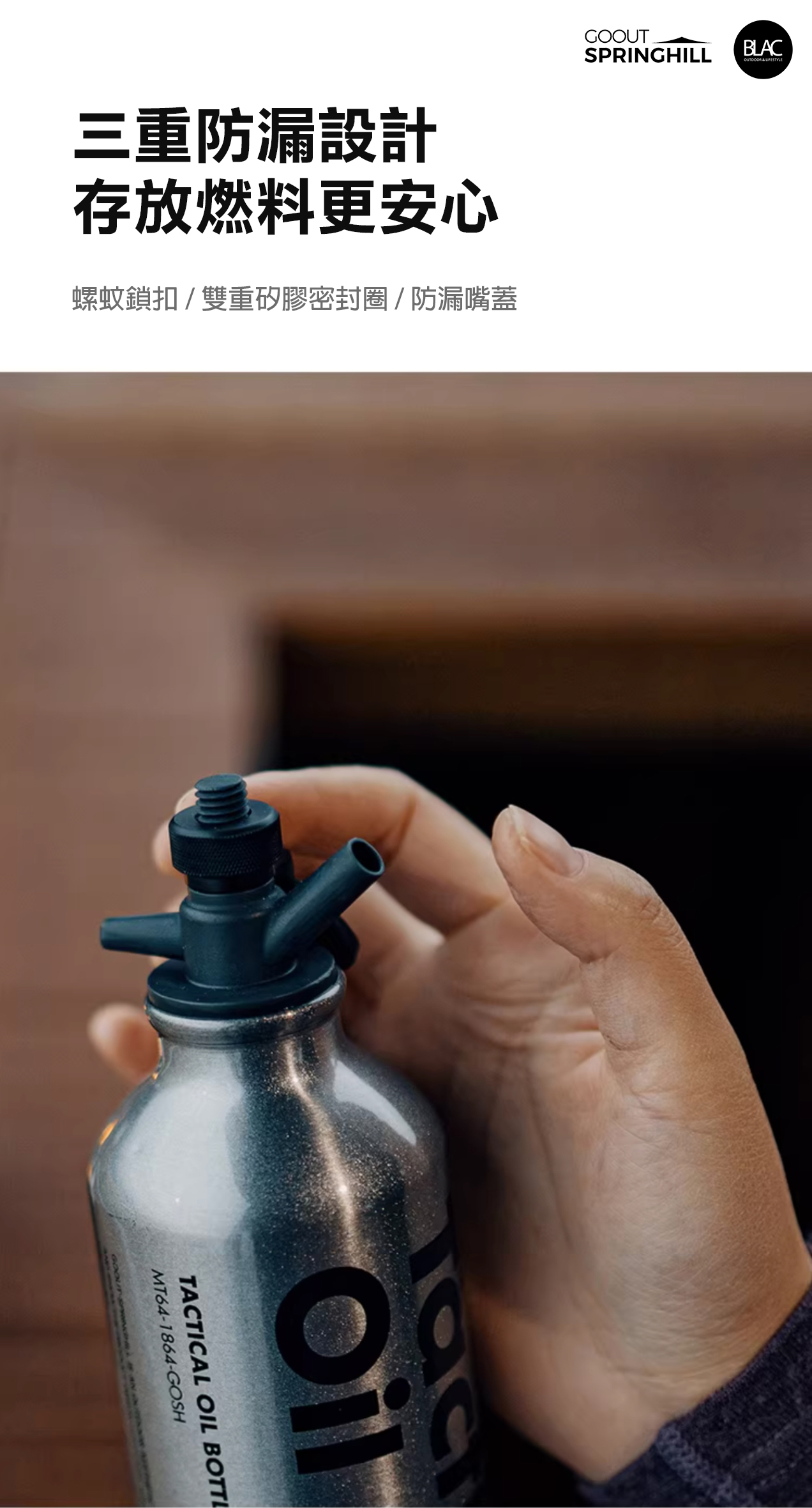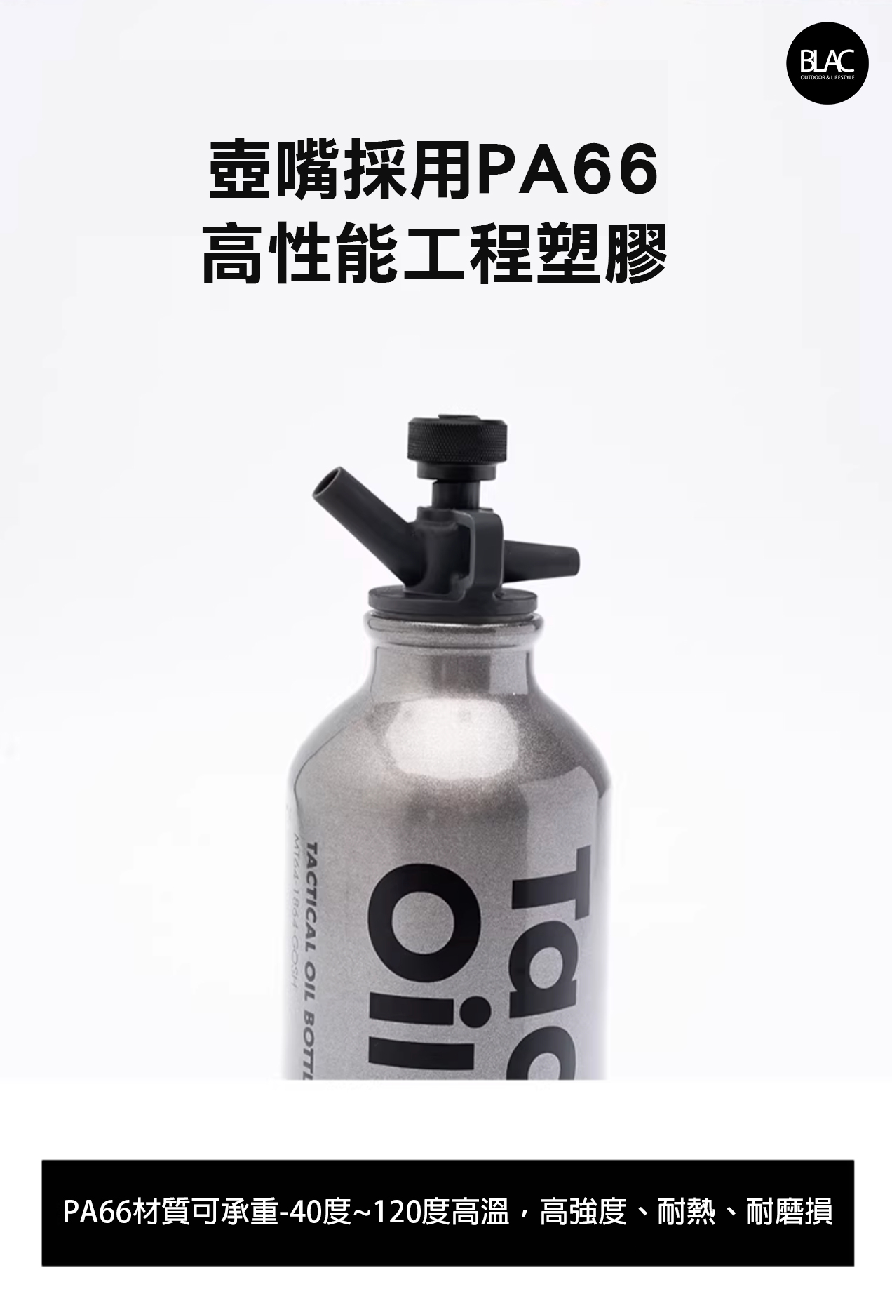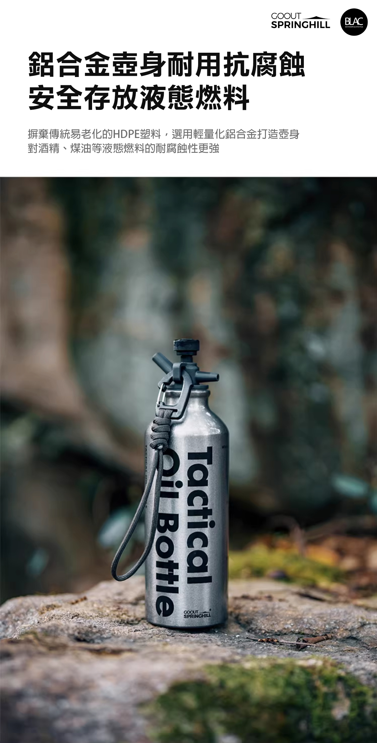 瓶身的部份採用了鋁合金,加上亮面噴砂塗裝及戰術風格字樣點綴,相較於塑料瓶身,擁有更好的耐腐蝕性,更適合長時間存放酒精及煤油,瓶口則採用耐高溫、耐磨損的PA66高性能工程塑膠,並附上帶有掛扣的尼龍掛繩,方便於戶外吊掛存放,隨時取用。