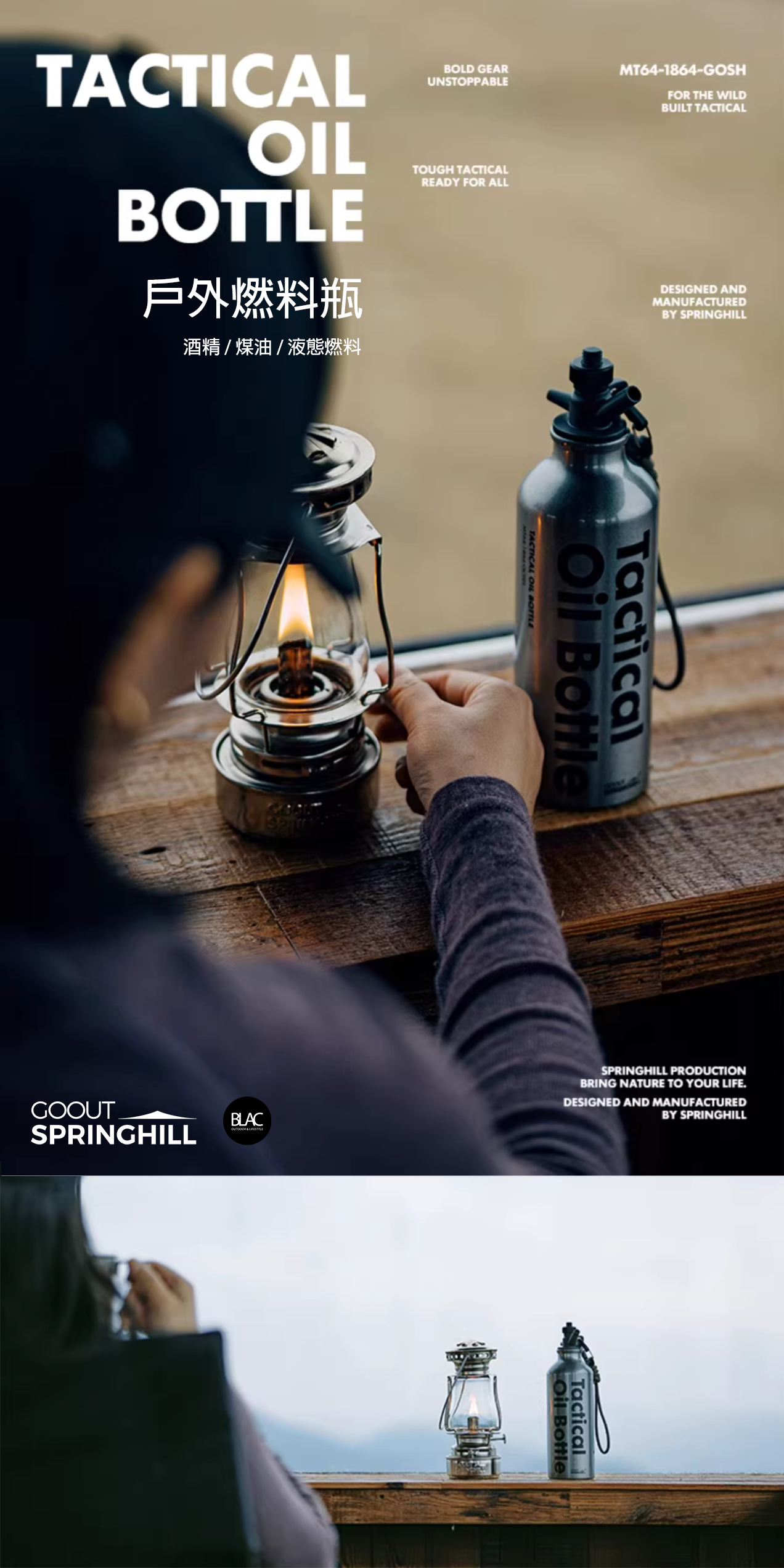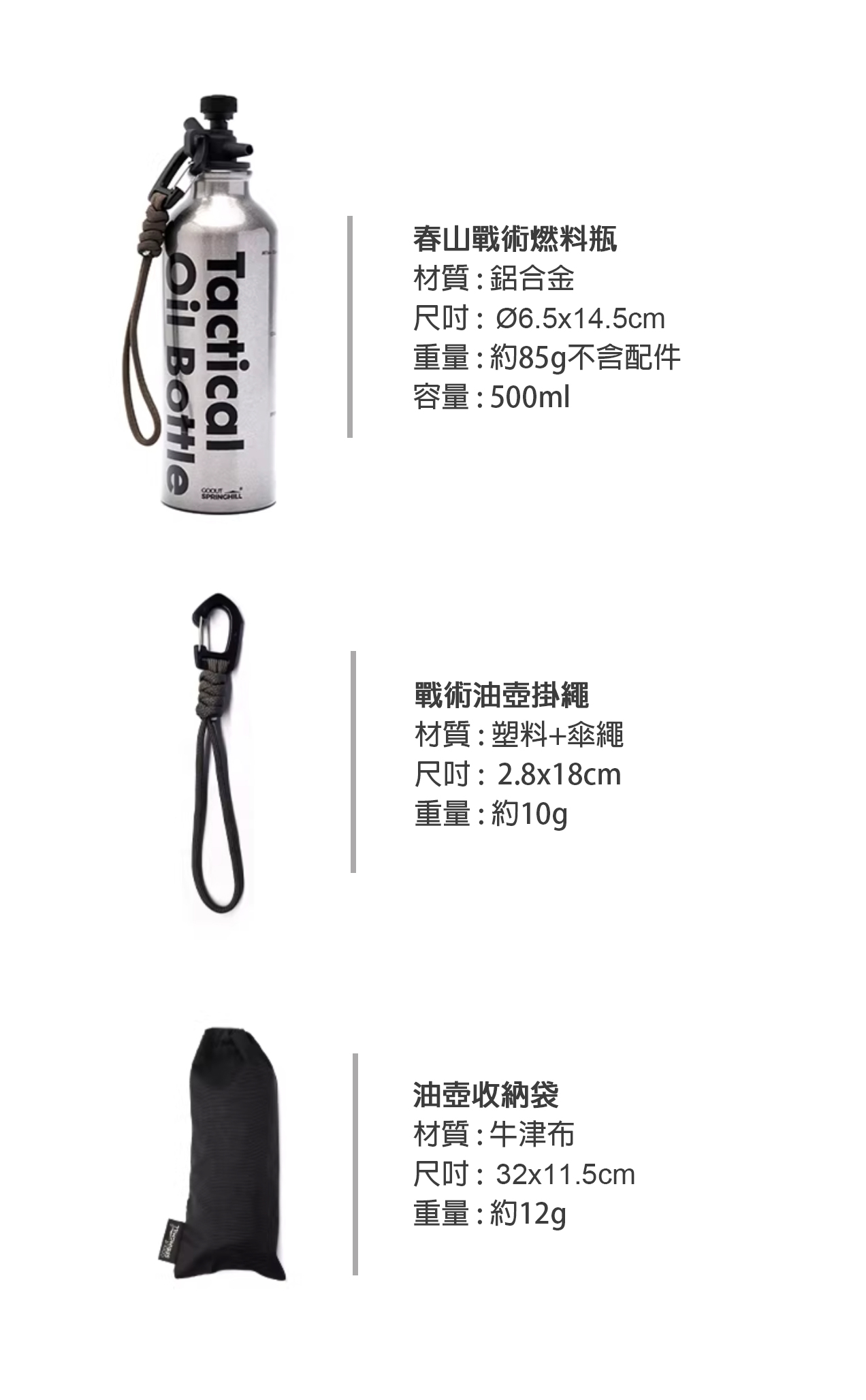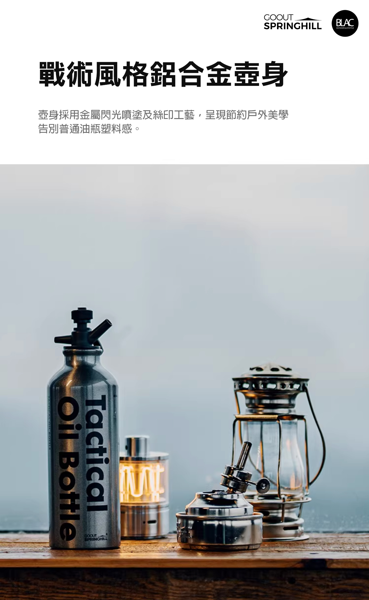 瓶身的部份採用了鋁合金,加上亮面噴砂塗裝及戰術風格字樣點綴,相較於塑料瓶身,擁有更好的耐腐蝕性,更適合長時間存放酒精及煤油,瓶口則採用耐高溫、耐磨損的PA66高性能工程塑膠,並附上帶有掛扣的尼龍掛繩,方便於戶外吊掛存放,隨時取用。