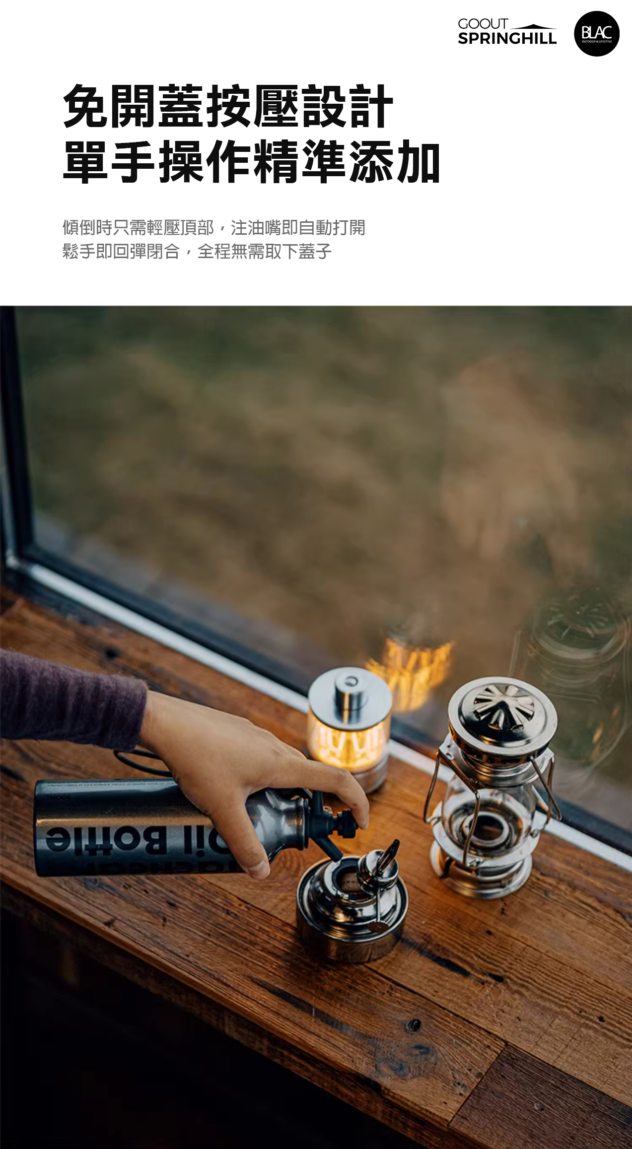● 添加燃料時,容量不可超過500ml,請預留一定空間平衡氣壓,避免液體因受熱膨脹溢出。