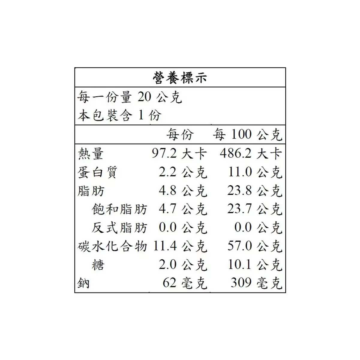 | 內容量/入數 | 20公克 X 125包 |