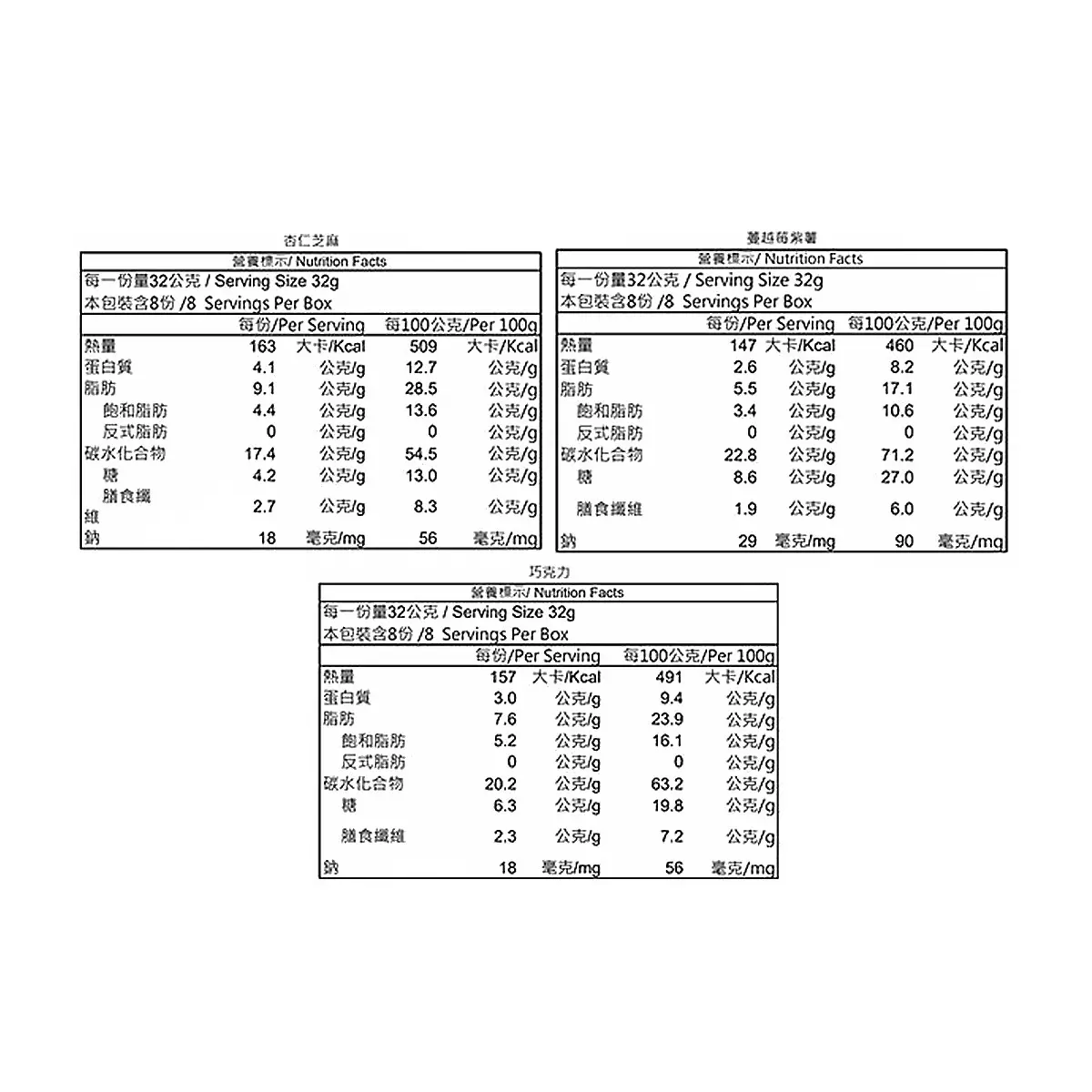 | 成分 | 杏仁芝麻口味 :澳洲燕麥、糖漿[黑糖、小麥、米、香草精(水、甘油、酒精、香草豆萃取物)、鹽]、杏仁、椰子油、椰子粉、葵瓜子、杏仁粉、芝麻籽、肉桂、混合濃縮生育醇液[混合濃縮生育醇(抗氧化劑),大豆油]。紫薯口味 : 澳洲燕麥、糖漿[黑糖、小麥、米、香草精(水、甘油、酒精、香草豆萃取物)、鹽]、紫薯雪花片、椰子油、蔓越莓乾(蔓越莓、糖、葵花油)、芝麻籽、椰子粉、葵瓜子、混合濃縮生育醇液[混合濃縮生育醇(抗氧化劑)、大豆油]、肉桂。巧克力口味 : 澳洲燕麥、糖漿[黑糖、小麥、米、香草精(水、甘油、酒精、香草豆萃取物)、鹽]、代可可脂黑水滴豆[糖、代可可脂(完全氫化棕櫚仁油、脂肪酸山梨醇酐脂)、可可粉、乳化劑(大豆卵磷脂、交酯化蓖麻酸聚合甘油酯)、香莢蘭醛]、椰子粉、椰子油、葵瓜子、可可粉、肉桂、混合濃縮生育醇液[混合濃縮生育醇(抗氧化劑)、大豆油] |