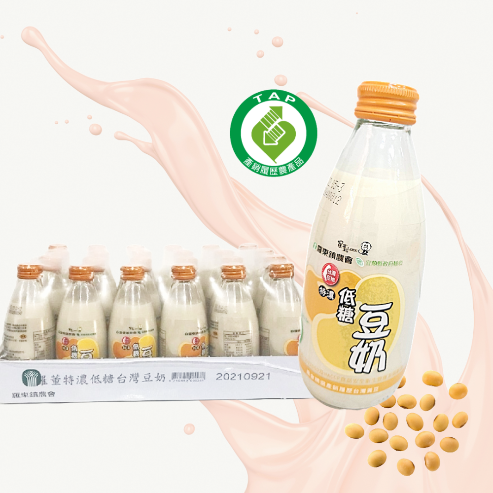 羅東鎮農會支持台灣農業,精選國產非基因改造且具產銷履歷之黃豆,比傳統養生豆奶更多豆量且低糖,口感濃郁,是值得細細品嚐的幸福原味。