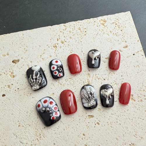 📌穿戴方便、重複使用,隨時隨地切換你的叛逆模式黑撞色立體造型設計美甲