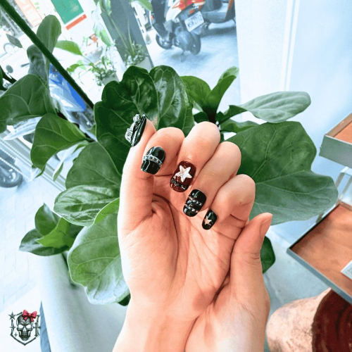 紅黑撞色為基底,搭配立體骷髏頭、星星與鉚釘裝飾,營造強烈視覺感的個性風格。