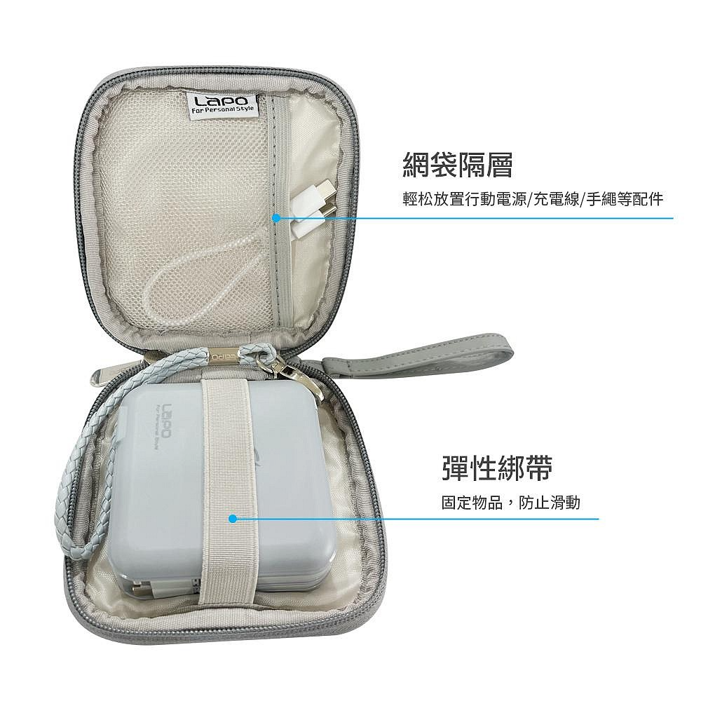 LaPO 多功能行動電源收納包專為 LaPO 行動電源設計,顏色搭配 LaPO 行動電源主機,一整套攜帶既美觀又便利。表面採用 PU 仿皮材質,生活防水,不小心倒翻了飲品也不需要擔心。