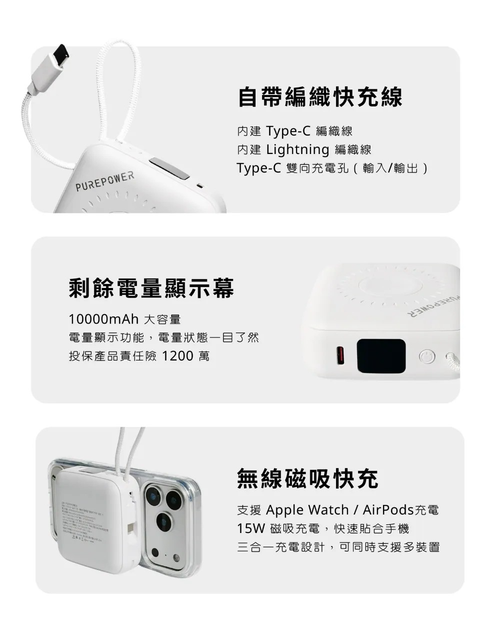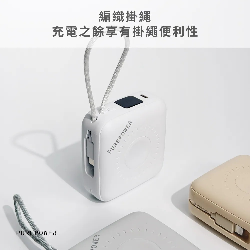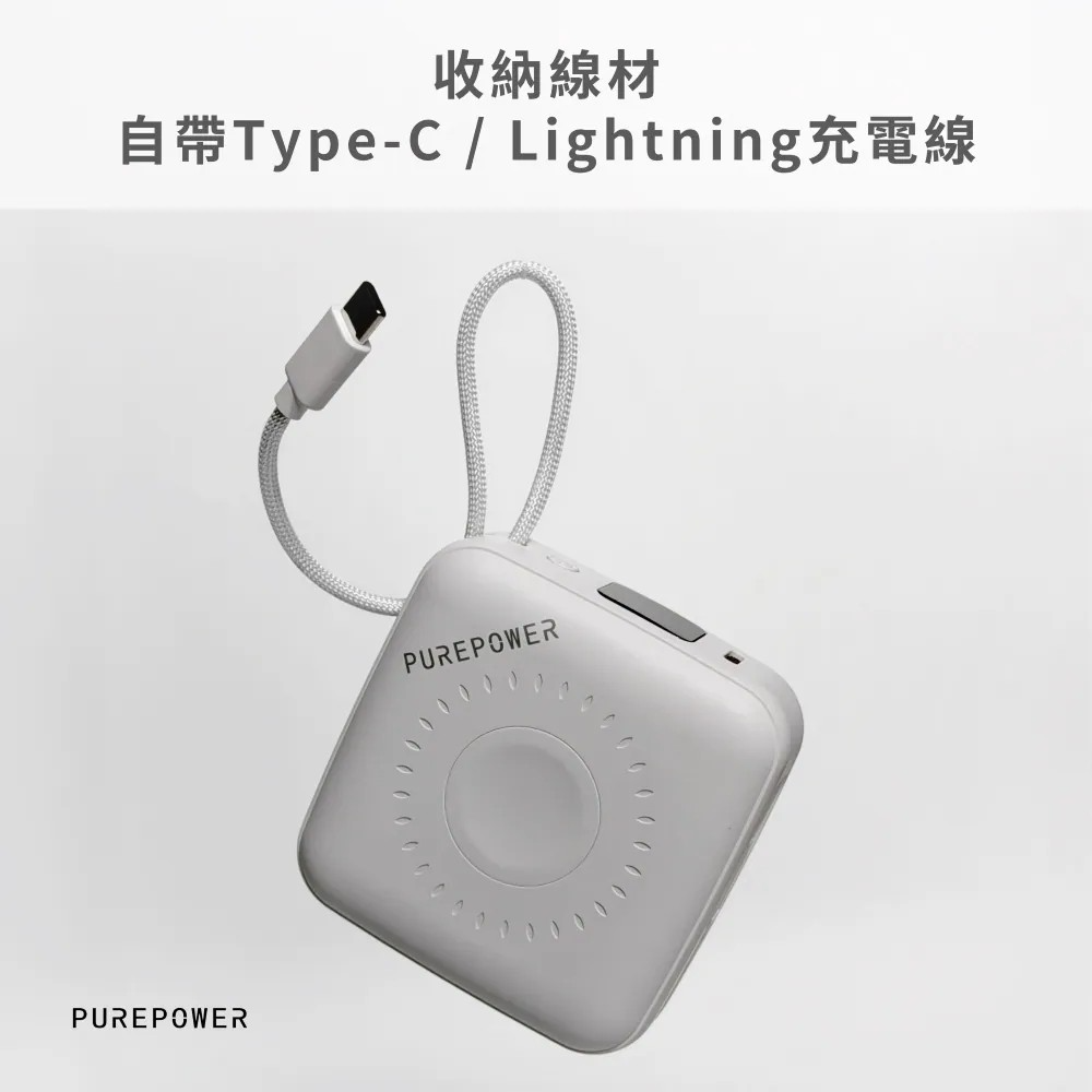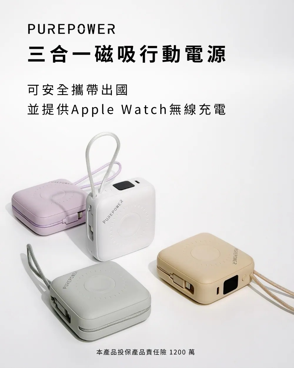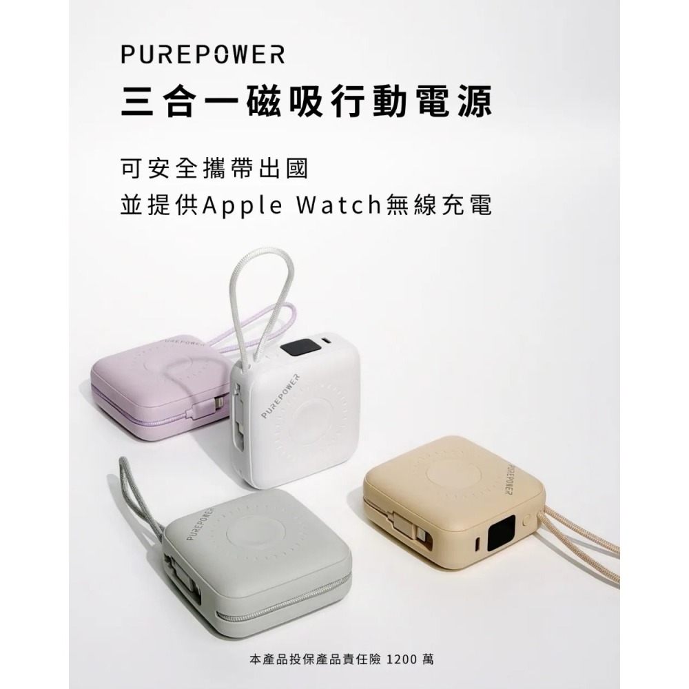 PUREPOWER 三合一磁吸行動電源,結合磁吸無線充電+內建雙線+Apple Watch 充電,輕巧隨行,隨時滿電。