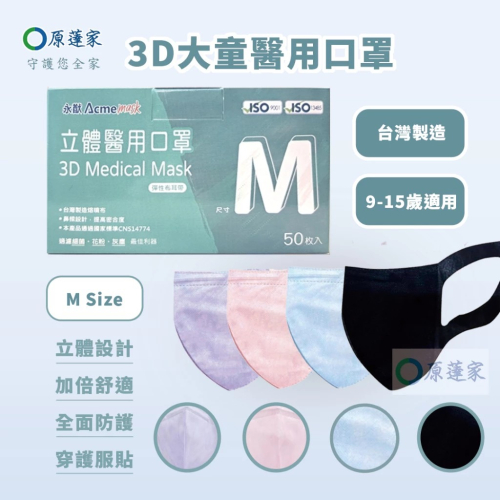 永猷 3D立體醫用口罩M號(黑/藍/粉/紫)50入/盒 台灣製 大童/小臉成人適用 MD雙鋼印/現貨供應/快速出貨