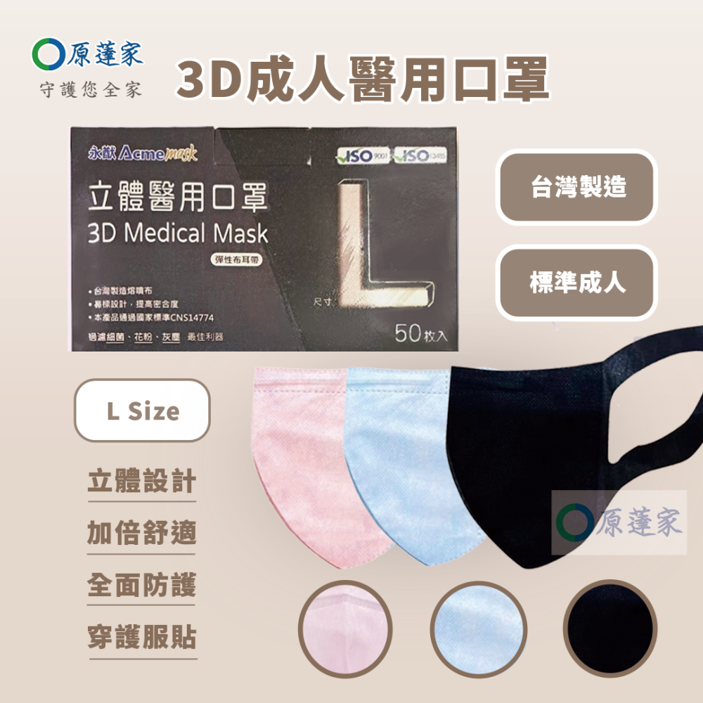 永猷 成人3D立體醫療用口罩L號(黑/藍/粉)50入/盒 現貨供應/台灣製造/迅速出貨