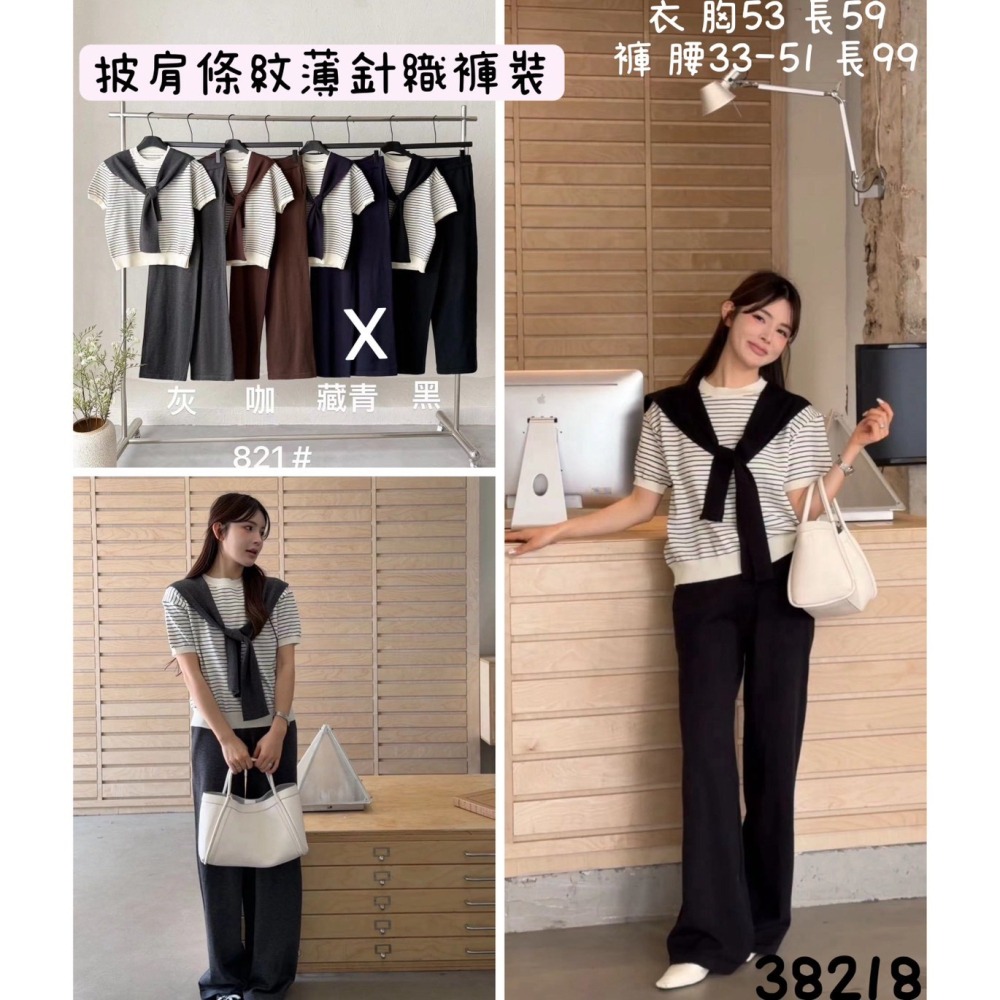 💎超值三件式組合:條紋針織上衣 + 造型披肩 + 彈力闊腿長褲。