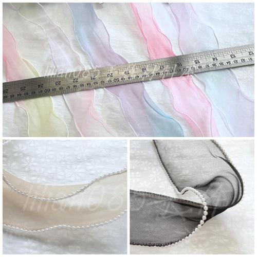 荷葉邊雪紗帶 拷邊雪紗帶 【A_漸層款】 ★寬度約4+-1cm 【B_珍珠款】 ★寬度約6+-1cm ------------------------------------------------------------------------------------------- ★一碼90cm,多份盡量不裁~ 因為有捲度多少會有伸縮誤差,但一定都是平鋪剪裁,非拉直剪裁喔。 ★★★波浪效果款式,寬度無法完全一致, 因為是裁切布料下去製作,多少會有"接點"(如圖),此屬正常現象,介意者請勿下單喔~ --------------------------------------------------------------------------- ★★★商品皆實體拍色,多少會因為光線、螢幕顯示器不同而有色差,可接受再下標喔! ★★★布料、包邊帶、織帶、緞帶等,是根據各位下單尺寸剪裁的,屬客製商品無七天鑑賞期之適用,售出恕不退換。