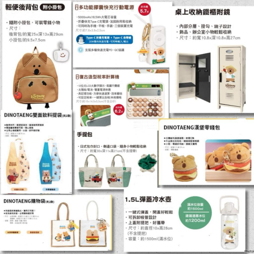 多功能膠囊快充行動電源 •5000mAh/18.5Wh 大電芯容量 折疊快充 Type-C充電頭,加固耐用易收納 可同時為手機、平板、手錶,三個裝置充電 For iPhone 15以上/Android 尺寸:約7.8x3.9x2.5cm 復古造型稅率計算機 經典復古造型結合可爱公仔 12位元LCD大數字顯示,易讀不費眼 太陽能/電池,雙重電源供應 具記憶功能,方便快速運算,效率翻倍 可設定稅率,一鍵算出含稅/未稅價格 尺寸:約15x14.5x5.5cm(不含公仔) DINOTAENG漢堡零錢包 立體親毛漢堡適型,歡葫Q彈 外出非扣在包包,隨意搭配都亮眼 小物、零綫好收納,療癒又實用 尺寸:約定9X高10cm 材質:聚酯纖維 DINOTAENG購物袋(共2款) •附適型皮革鑰匙扣,實用又可愛! 帆布麻布拼接,日常購物超好用 尺寸:冰淇淋款 約寛21X高22.5X側16cm 漢堡款 約寬24X高23 X側12.5cm 材質:提袋,黃、尼龍、帆布 掛飾:合成皮革、鋅合金 手提包 日式包巾封口•側邊口袋,隨身小物輕鬆收納 尺寸:約寬30x深11x高21cm(不含提帶) 桌上收納鐵櫃附鏡 內部分層、掛勾、鏡子設計 飾品、辦公室小物輕鬆收納 尺寸:約寬10.8x深10.8x高27cm 輕便後背包 附小掛包 隨附小掛包,可裝零錢小物 尺寸: 後背包/約寬25x深13x高29cm 小掛包/約9.5x7.5cm 1.5L彈蓋冷水壺 一鍵式彈蓋,開蓋好輕鬆 可拆卸吸管設計 上蓋附提把,好攜帶 尺寸:約直徑10x高28cm (不含提把) •容量:約1500ml(滿水位) 商品全新未拆封 追求完美者請勿下標 有無評價者一律聊聊詢問 圖文來源:7-11FB