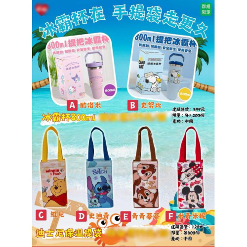 800ML提把冰霸杯 史努比 酷洛米款 迪士尼保冷提袋