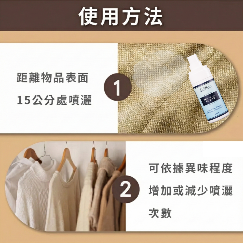 用法:距離15-20公分噴於欲除臭的空間、衣物、布料、物品,讓產品自然揮發,發揮除臭與抑菌效果。