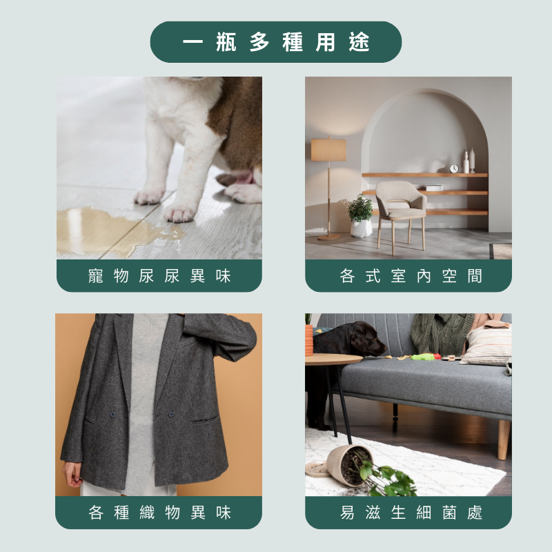 用途:人與寵物的活動空間、衣物、布料、物品的除臭與芳香