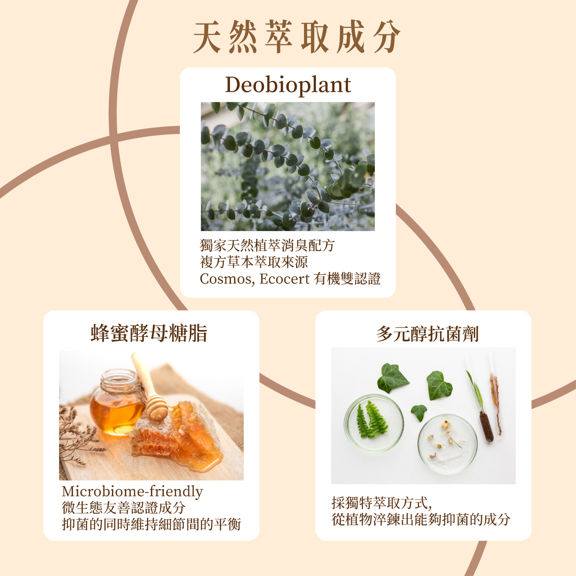 主成分:DEOBIOPLANT植萃中性消臭劑,蜂蜜酵母糖脂,多元醇抗菌劑