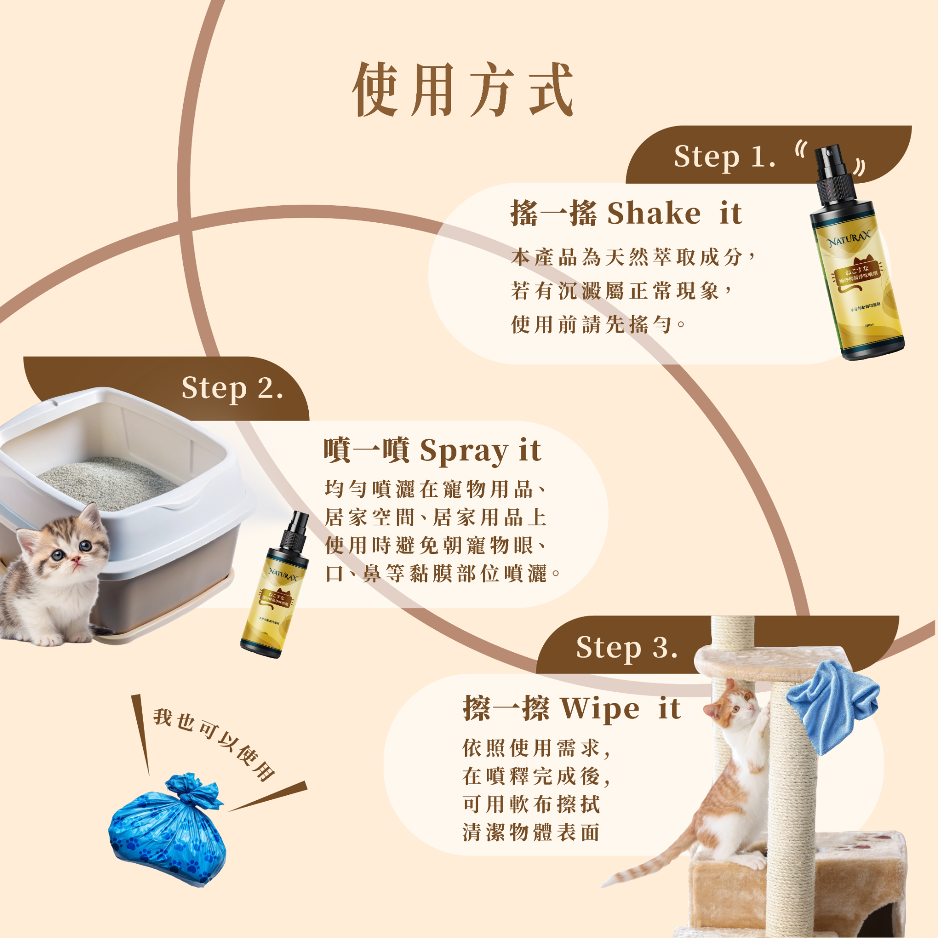 直接噴在貓窩、貓砂、貓尿尿便便地方,讓產品自然揮發,發揮除臭與抑菌效果。