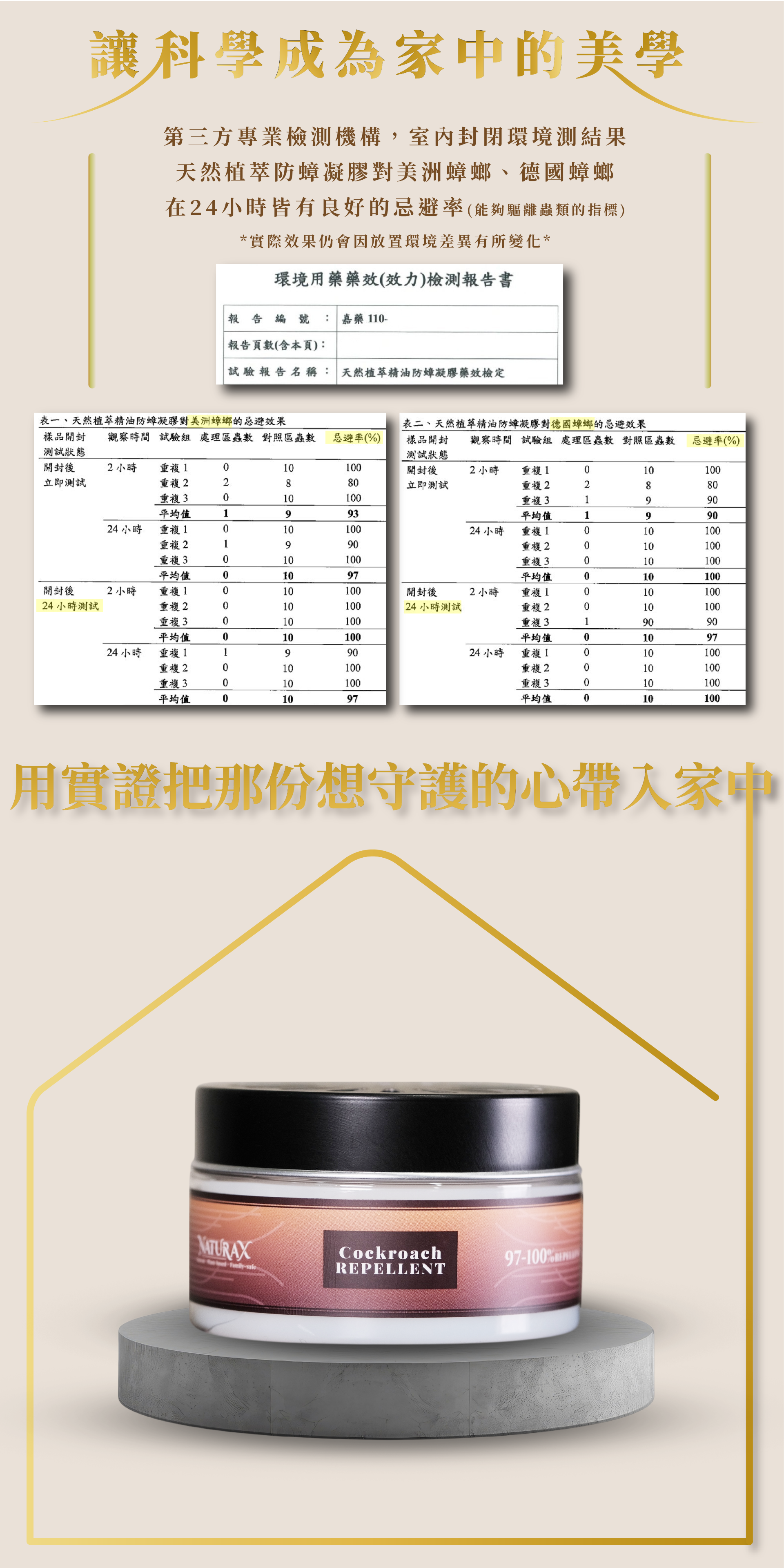• 經嘉南藥理大學實驗室測試對美洲蟑螂、德國蟑螂第24小時忌避率達97-100%