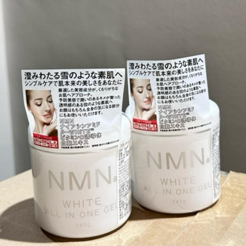 NMN White All In One 呈現凝膠狀,極為光滑、柔軟,易於塗抹並快速被肌膚吸收。凝膠不會產生黏膩感或堵塞毛孔。 獨特配方可取代6個步驟。忙碌的人和喜歡簡單保養的人,只需一罐NMN乳霜,可以全面照顧自己的皮膚,護膚過程不僅節省了時間,也減少了「錢包的痛苦」。 ✔️提亮均勻膚色,改善暗沉、無生氣的肌膚,打造潔白如雪的肌膚 ✔️小資女最愛 All in one一瓶搞定 ✔️打造滋潤,幫助肌膚保持光滑。 ✔️改善皮膚彈性和緊緻度 使用方法: 取適量產品,用手指輕拍於額頭、鼻子、臉頰和下巴,然後以打圈方式均勻塗抹於整個臉部。  輕輕拍打至產品完全被皮膚吸收。 每天早晚使用,早上應與防曬乳一起使用。 產地:日本 製造/效期:2024.8/5年 #315 https://s-cf-tw.shopeesz.com/file/tw-11134208-7rbk3-m6hv4eye0rko73 https://s-cf-tw.shopeesz.com/file/tw-11134208-7rbkd-m6hv4eye0rc2a7