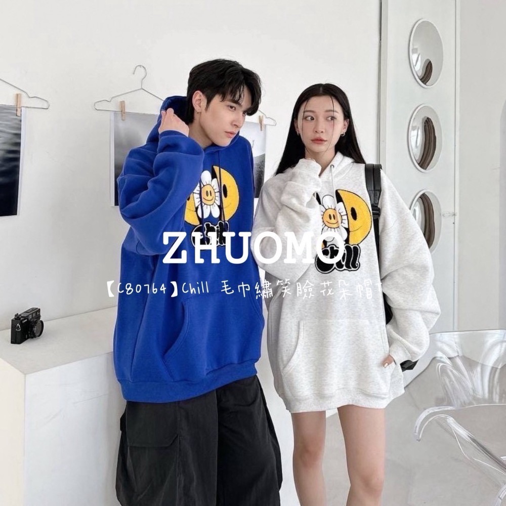 【限時特賣】正韓 韓系 Chill 毛巾繡笑臉花朵帽T 大學t 厚磅 長袖 印花 衣服 大尺碼 上衣 男裝 衛衣 情侶衣