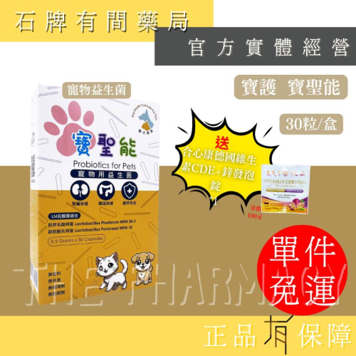 https://s-cf-tw.shopeesz.com/file/tw-11134208-7rbk7-maxnb9dmu920af ⚡送合心康德國維生素CDE+鋅發泡錠*1,可累加計算,若贈品贈完則改送其他精美小禮物⚡ ⭐腎臟保健、腸道保健、維持免疫 ⭐無香料‧無色素‧無緩瀉劑‧無防腐劑 |商品說明| 商品名稱:寶聖能寵物用益生菌 容量:30顆/盒 商品成分:微結晶狀α-纖維素、LM乳酸菌組合�(胚芽乳酸桿菌 Lactobacillus plantarum MFM 30-3 50億、副乾酪乳桿菌 Lactobacillus paracasei MFM 18 50億)、果寡醣粉(非基改玉米澱粉、果寡醣)、比利時果寡醣、硬脂酸鎂 食⽤⽅式:可直接餵食或打開膠囊混入飼料或罐頭後再餵食 原產地:臺灣 Made in Taiwan 保存方法:請至於乾燥陰涼(15℃~30℃)之場所,及孩童不易取得處,避免陽光直射。 總經銷:寶護醫材科技有限公司 地址:新北市中和區中山路二段296號7樓之5 電話:(02)8668-8365 乳酸菌為國立臺灣大學動物科學技術學系技術移轉授權 中華民國專利證號:發明第1770811號 |注意事項| ●請存放乾燥陰涼處,避免光線直接照射,以確保品質。 ●請放置於孩童無法拿取組。 ●特殊疾病者時前請諮詢醫師、藥師等專業⼈⼠。 ●本品不含任何食品添加物,每批原料⾊澤稍微不同,偶爾有假性結塊屬正常現象,輕碰即可分散且不影響品質請安⼼食⽤。 _______________________________________________________ │販售業者資訊│ 藥商許可執照所載藥商名稱:石牌有間藥局 藥商地址:台北市北投區石牌路二段313號1樓 藥局電話:02-2876-0111 藥局許可執照字號:北市衛藥局(投)字第5901163741號 食品業者登錄字號:A-278967240-00001-3 ※商品品牌名稱及圖片僅用於商品說明,非作為商標之使用,商標與圖片之智慧財產權為原權利人或原廠商所有。 0011