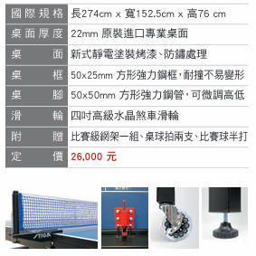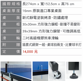 .附贈:插套式網架一組、桌球拍兩支、比賽球半打