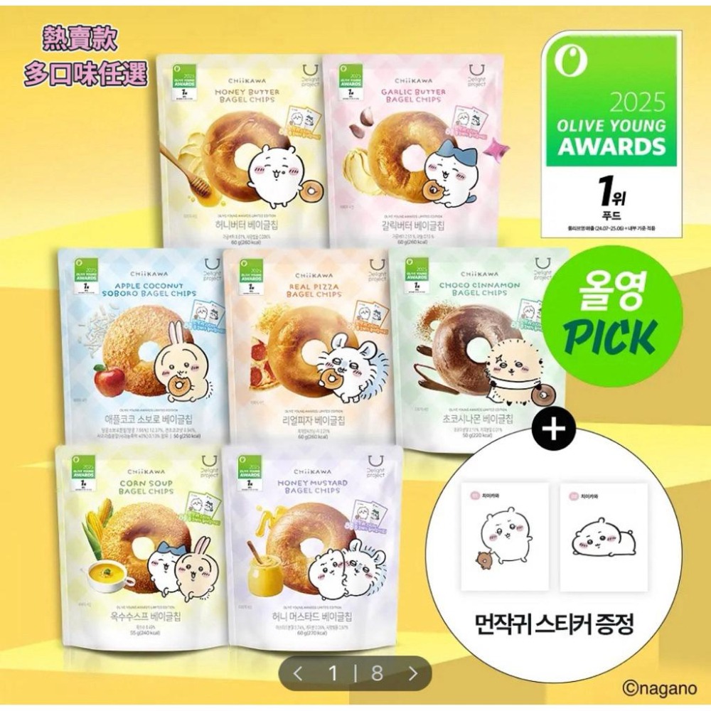🔥 韓國 Olive Young 熱賣款 吉伊卡哇 Chiikawa 聯名貝果餅乾 非油炸、香脆不膩,人氣多口味任選,現貨快速出貨 🍩 商品描述|吉伊卡哇貝果餅乾 韓國 Olive Young 熱賣款 吉伊卡哇 × Delight Project 聯名貝果餅乾 香脆不油膩,下午茶、追劇、辦公室都很適合。 ✔ 非油炸貝果切片 ✔ 口感酥脆、香氣濃郁 ✔ 可愛包裝,送禮自用都合適 ✔ 韓國原裝進口 🍯 口味選擇 蜂蜜奶油 蒜香奶油 蘋果椰子 披薩口味 巧克力肉桂 玉米濃湯