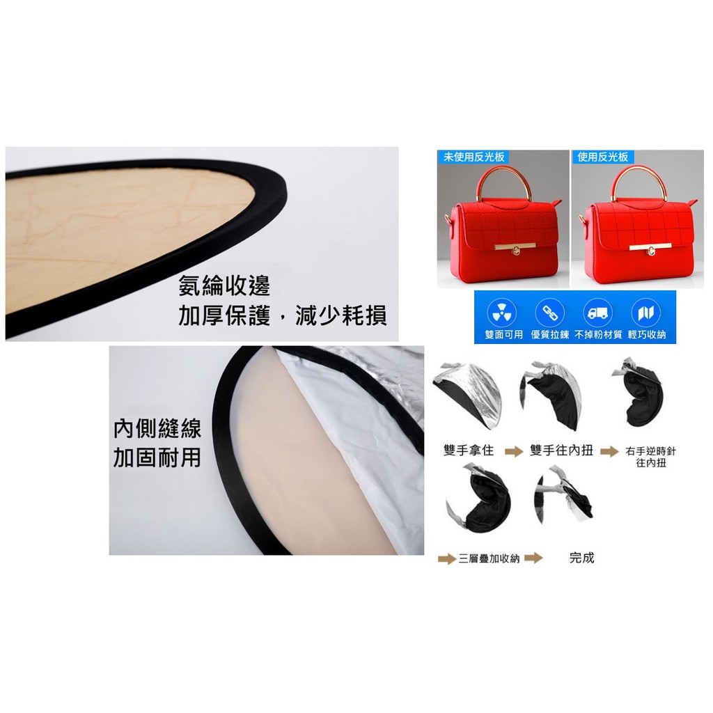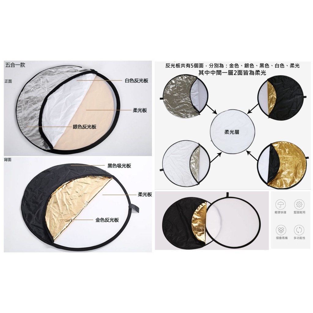【註】:五合一代表的不是指五片反光板,而是柔光板搭配可更換的雙面外罩組成,以拉鍊固定,可依照拍攝需求透過變換外罩達到不同光線/拍照效果。