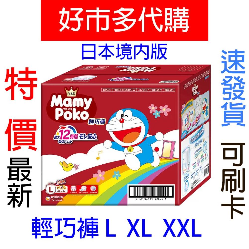一單限購一箱 ※單箱原箱寄出,併購額外裝箱寄出。 📌注意事項: ■【正品】商品下標後-才至『好市多』店內購入,效期都是賣場最新 ■⛔️【缺貨】⛔️若好市多缺貨商品會『聊聊』通知買家取 消訂單,下單後請務必留意「聊聊」訊息 ■【超重超長限制】蝦皮店/超商均有限重5公斤/單邊長45公分內,總長105公分內限制,若超重及超長,請選『店到家宅配 - 大型包裹』或聊聊詢問 ■【其他好市多商品】若有其他想購買的好市多商品,但賣場沒上架,可聊聊詢問 👉品名: 滿意寶寶 哆啦A夢輕巧褲 日本境內版 L號 176片 內容量/入數: 44片 X 4入 商品重量: 6.9公斤 商品尺寸: 長 47公分 X 寬 31公分 X 高 41.5公分 👉品名: 滿意寶寶 哆啦A夢輕巧褲 日本境內版 XL號 152片 內容量/入數: 38片 X 4入 商品重量: 6.1公斤 商品尺寸: 長 45公分 X 寬 31.5公分 X 高 41.5公分 👉品名:滿意寶寶 哆啦A夢輕巧褲 日本境內版 XXL號 104片 內容量/入數: 26片 X 4入 商品重量: 5.3公斤 商品尺寸: 長 47公分 X 寬 33公分 X 高 40公分 使用方式: 像小內褲般穿著、使用 產地: 日本 商品介紹: 最大 12 小時吸收體。過夜安心,長時間外出也安心防漏 日本專利3道防漏側邊,完美服貼 防漏安心剪裁,柔貼包覆到肚臍 超柔軟腰腿圍,提升柔軟舒適度 360度透氣素材,迅速排出濕氣不悶熱 尿濕顯示,尿尿後變藍綠色 日本製造