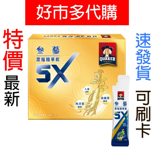 ※「7-11全家免運」取付>>賣場小編 📌注意事項: ■【正品】商品下標後-才至『好市多』店內購入,效期都是賣場最新 ■⛔️【缺貨】⛔️若好市多缺貨商品會『聊聊』通知買家取 消訂單,下單後請務必留意「聊聊」訊息 ■【超重超長限制】蝦皮店/超商均有限重5公斤/單邊長45公分內,總長105公分內限制,若超重及超長,請選『店到家宅配 - 大型包裹』或聊聊詢問 ■【其他好市多商品】若有其他想購買的好市多商品,但賣場沒上架,可聊聊詢問 品名 : 桂格 5X參蔘濃縮精華飲 15毫升 X 34入 內容量/入數 : 15毫升 X 34入 商品重量 : 510公克 成分 : 叁蔘濃縮液 (水、西洋蔘、人蔘、蓮子、百合、高麗蔘)、冰糖 商品用途 : 5倍人蔘濃縮精華,液態濃縮好吸收,讓你迅速補充能量、持續好精神 叁蔘合用:人蔘補氣、西洋蔘穩氣、高麗蔘順氣 搭配蓮子、百合調合,溫潤少負擔,適合長期飲用 輕巧包裝,讓你便利攜帶、即時補充 使用方式 : 小心撕開包裝袋後,請立即飲用完畢 每天建議飲用一包 (15ml),可視個別需求調整。15歲以下或特殊體質者,請減半或酌量飲用 保存方式 : 請置於陰涼乾燥處 (避免置於潮濕、高溫或曝曬等場所) 本產品之品質經嚴格管控,如因運送、陳列、保存等過程而致產品受損、破裂或膨包等現象,請勿飲用 食品業登錄字號 : A-122102473-00000-9 產品責任險契約字號 : 70-112-03257032-00034-PDL 製造/進口商名稱 : 佳格食品股份有限公司 製造/進口商電話 : 0800-006600 製造/進口商地址 : 台北市大安區仁愛路三段136號5樓 注意事項 : 1. 請洽詢醫師或營養師有關於食用本產品之意見;均衡的飲食與適當的運動為身體健康的基礎 2. 本產品具有天然植物萃取精華,偶有沉澱或色差屬於正常現象,請搖勻後食用 3. 本包裝袋屬於鋁箔材質,不可直接微波使用 4. 本產品經高溫滅菌處理